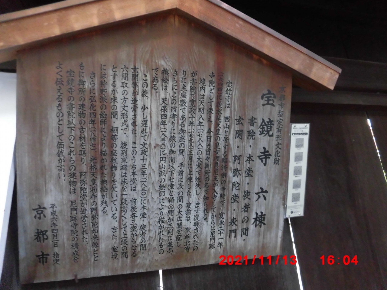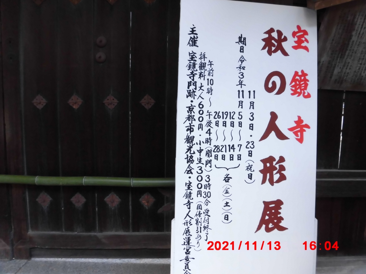 京都市観光で立ち寄りました。西山宝鏡寺 (人形寺)は、本法寺の南にあった臨済宗系単立の寺院で、本尊は聖観音菩薩、近世には皇女が入寺する尼門跡寺院であり、百々御所(どどのごしよ)、人形寺(にんぎょうでら)とも呼ばれています。お寺の由来は複雑で分かり難かったですが、現在は数多く所有する人形を展示することで有名なお寺です。訪問時は時間が遅くなり閉館してしまっていて入れませんでした。
