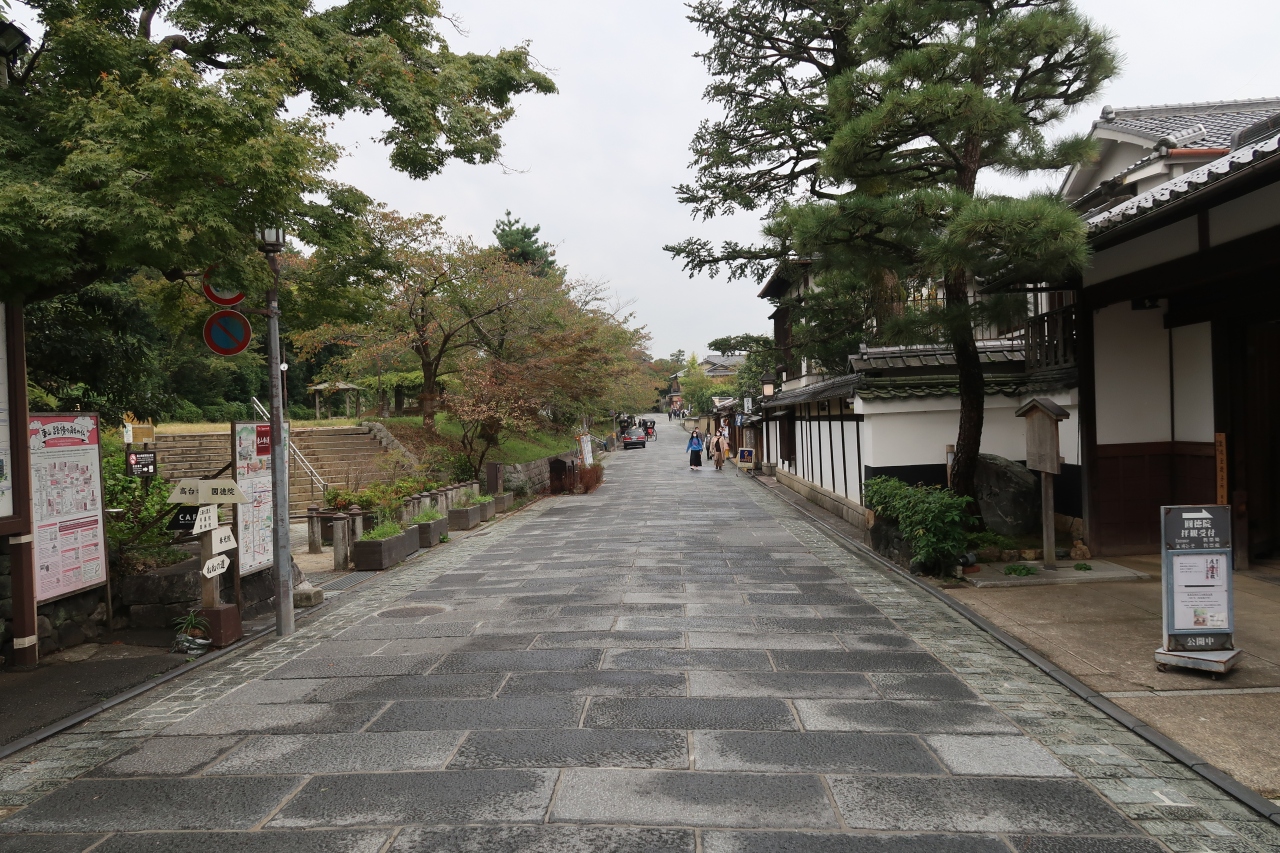 長楽館前から始まり、二年坂・産寧坂方面へ向かう石畳の道です。道を挟んで東西に、豊臣秀吉の正室ねねゆかりの寺、高台寺と圓徳院があるため、「ねねの道」と呼ばれているようです。電柱がないので広々としていて、道の脇には人力車も停車していました。