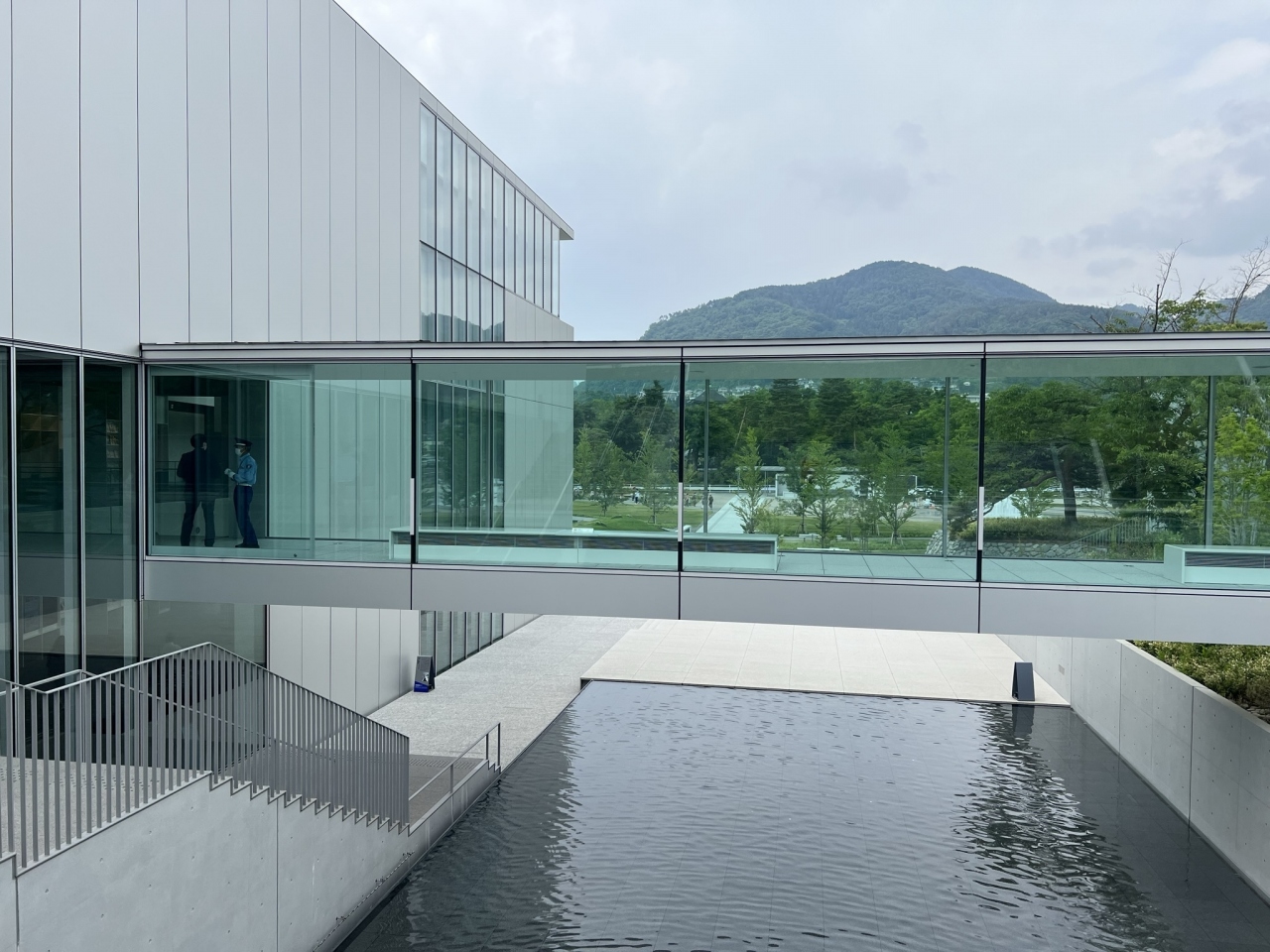 善光寺の本堂から歩いて5分、城山公園の入口近くにある近代的な建物が長野県立美術館。壁の多くが全面ガラス張りになっていて、開放的な館内になっています。1966年に長野県信濃美術館として開館されたのがはじまりですが、令和3年に長野県立美術館としてリニューアルオープンしました。