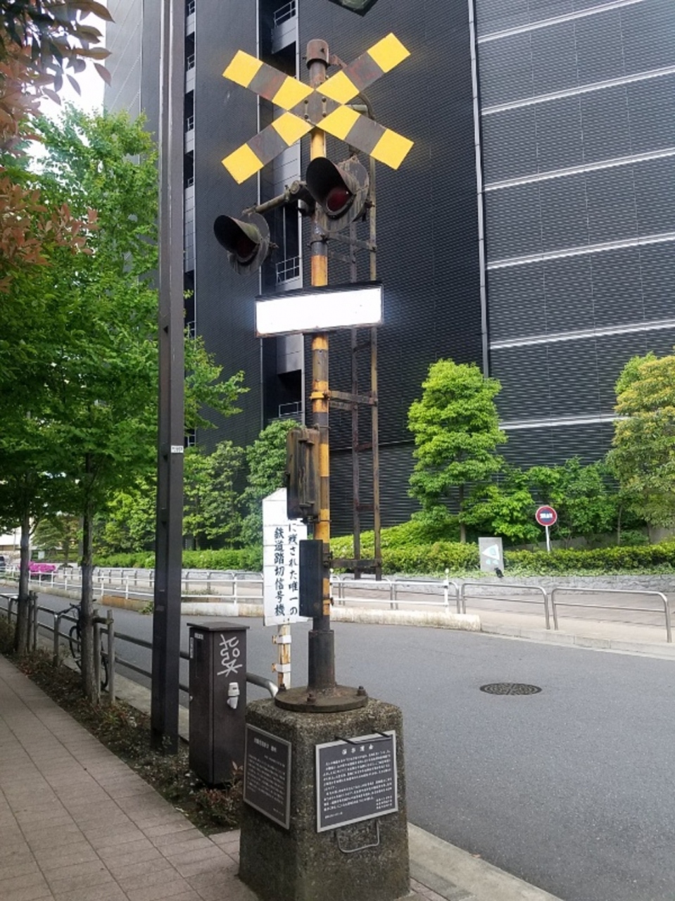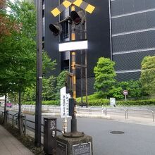 築地大橋を勝どき側から渡って直進し新尾張橋も渡って高速道路に出会った所で右に曲がろうとしたら歩道の角に電車の踏切があって度肝を抜かれました。かつて貨物線が走っていたときの名残だそうで銀座で唯一の鉄道踏切信号機として残されているようです。何にしても唐突な出会いでした。