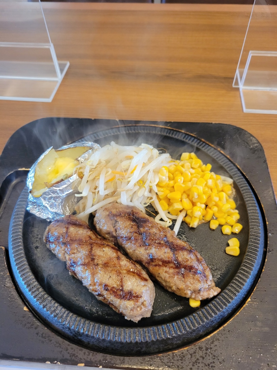 熱々鉄板にハンバーグ、コーン、もやし炒め、じゃがいもバター