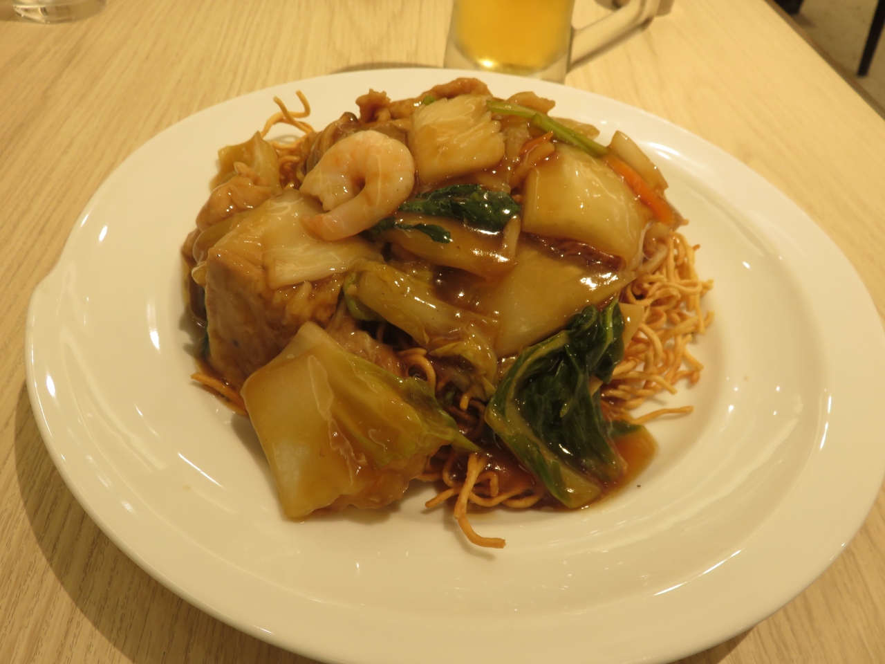 成田空港は今外国人の来日がなく、ターミナルのレストランも営業しているところはまばらです。第2ターミナル4階の謝朋殿は営業中。五目焼きそばを頼んだら揚げ麵か炒麺かを聞かれ、揚げ麵にしたが駄菓子の揚げ麵のようであり残念。さらに生ビールと同時に配膳は早すぎるだろう。ちょっと嫌な感じがした。