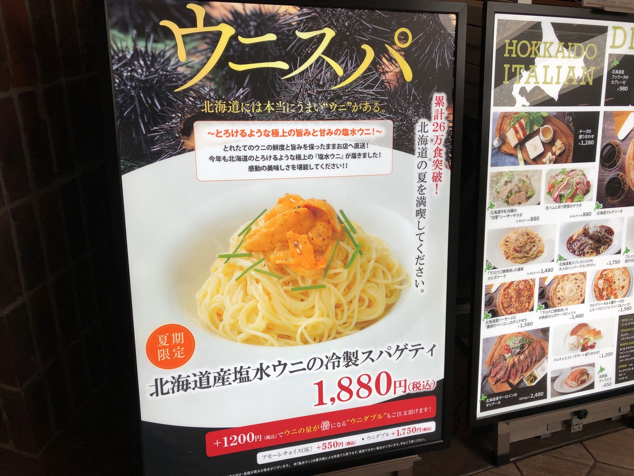 調布駅直結のトリエの5階にあります。平日の昼なら並ばず入れるかな…。毎年期間限定で出るウニパスタを食べました。北海道イタリアンなのでウニも根室産でした。シンプルなパスタにウニの旨味が映えました。プラス1200円でウニが倍のせられるそうです。