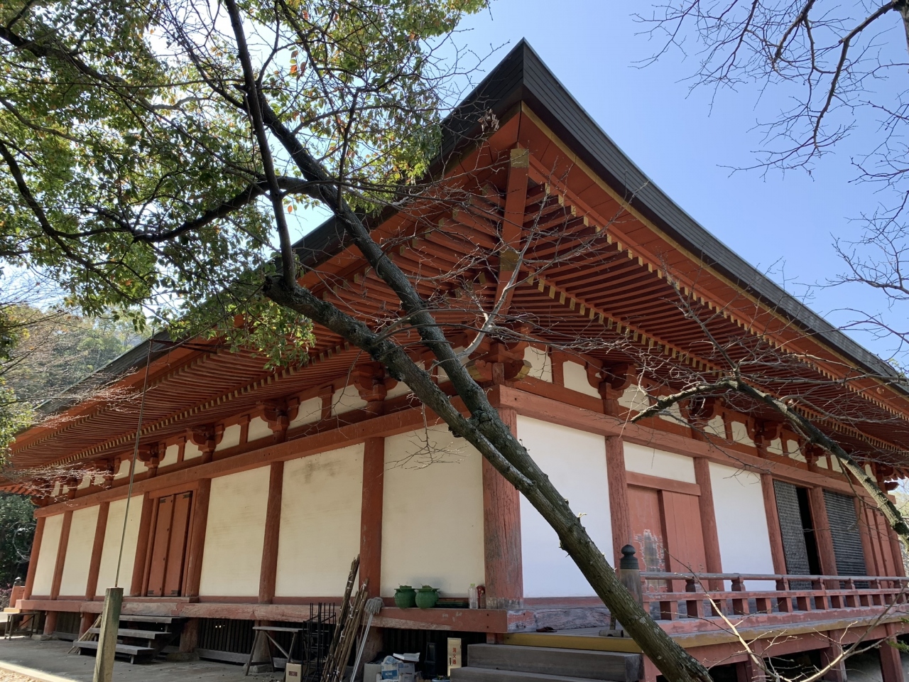 創建は古く、藤原鎌足の子の定恵が開山で、鎌足の孫の宇合が716年に建立したといわれています。和洋と唐用を組み合わせた建築で、朱塗りの柱や木々の組み合わせがとても美しいです。南北時代には支院が41坊もあったそうで、盛大な力を持ったお寺だったようです。太山寺には多くの絵画や経典などの書物など宝物があり、博物館などに収容されています。