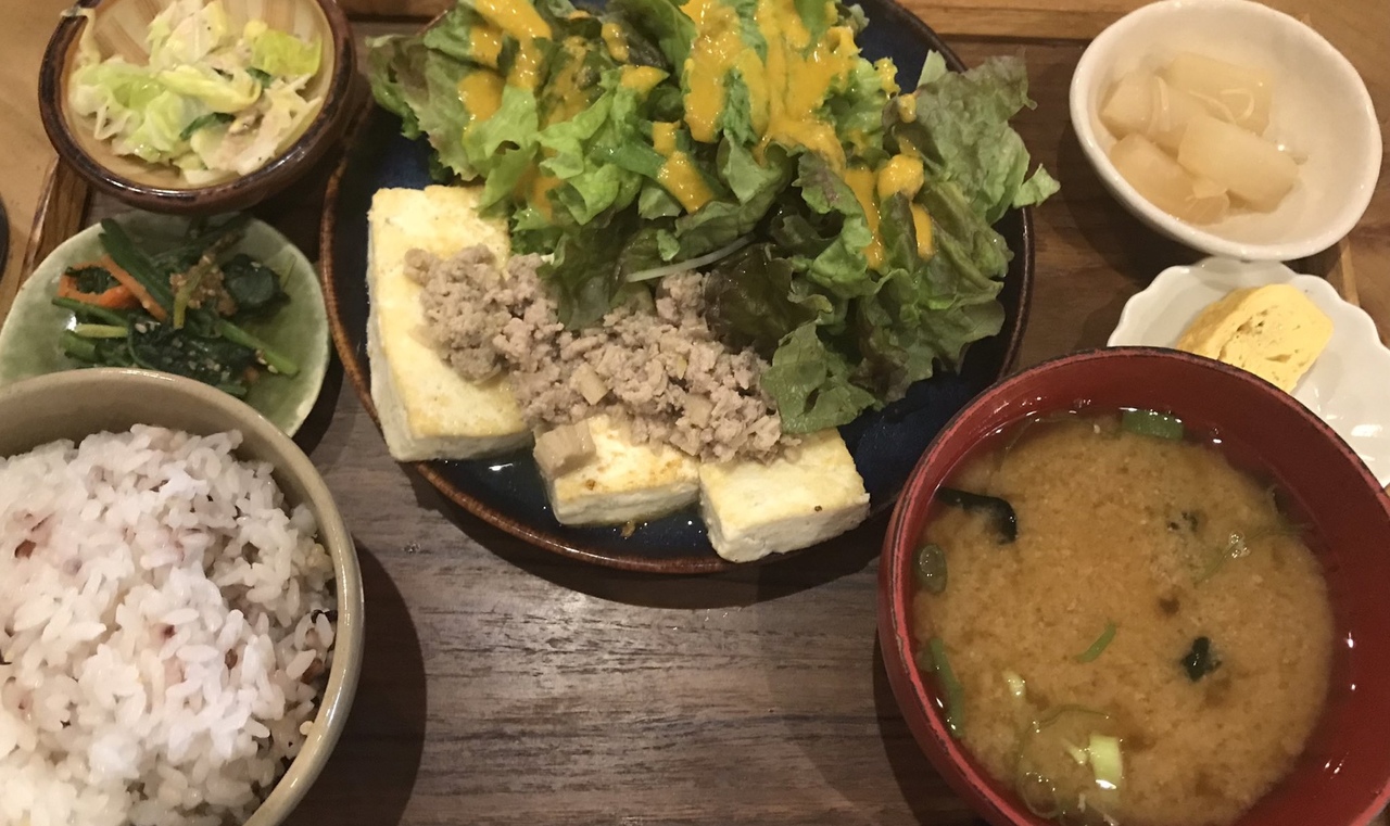三鷹駅から10分ほどの場所にあります。いつも通りがかりナチュラルな内装がステキだなあと見ていましたが思い切ってランチに入ってみました。豆腐ステーキ定食を食べました。豆腐だけどボリューム感あり且つヘルシーなところが気に入りました。