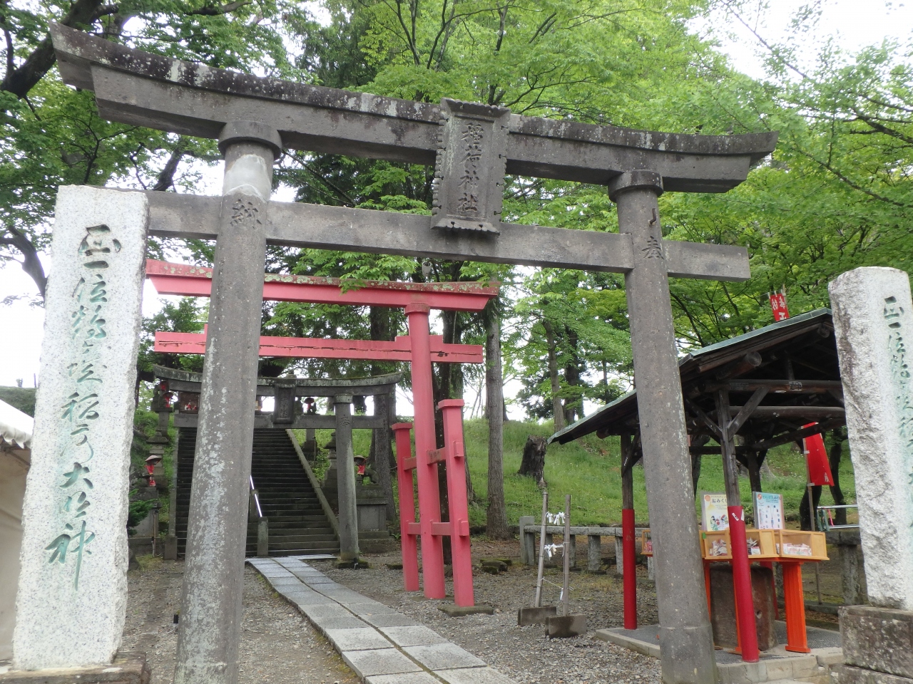 鶴ヶ城(若松城)の天守閣の近くに、この小さな神社があります。約600年前にこの城がつくられた頃から存在しているそうです。参道の入り口に石造りの鳥居と朱塗りの鳥居があります。城内にキツネを祀った神社がなぜあるのか疑問に思いました。