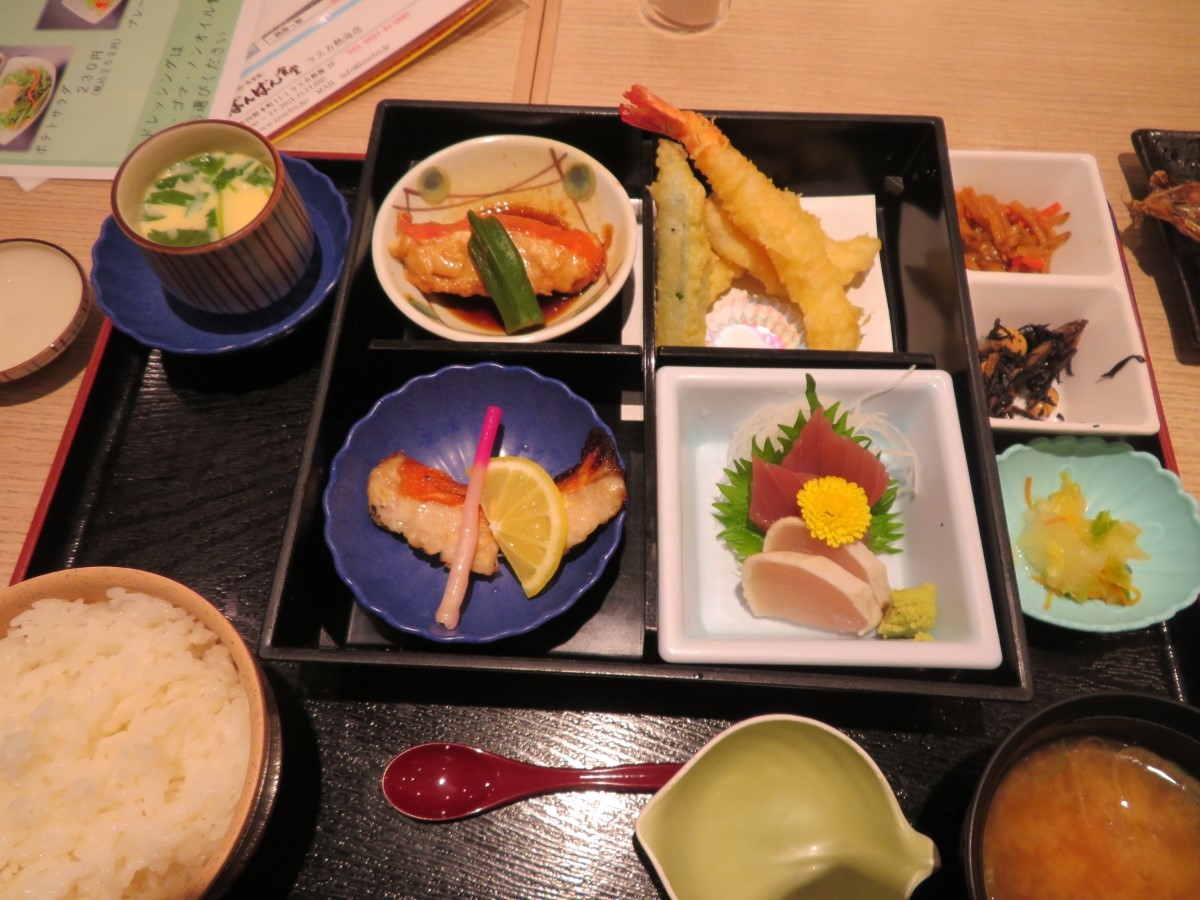 今回はばんばん膳という定食を。金目鯛西京焼き、金目鯛煮付け、天麩羅、刺身などなどが入って1950円。