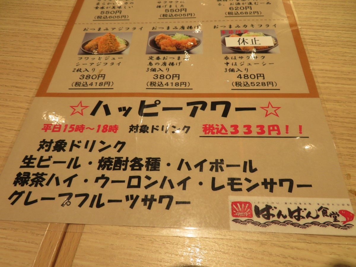 平日午後3時から6時の間はハッピーアワーということでジョッキ生ビールも税込み333円とお得。