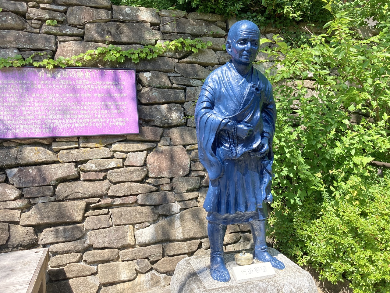 有馬温泉のお寺が集まっているところに、行基の像がありました。ちょうど、温泉寺前あたりです。ねがいの庭と書いてありますが、行基の像の隣の説明には、ねがいの泉と書いてありました。