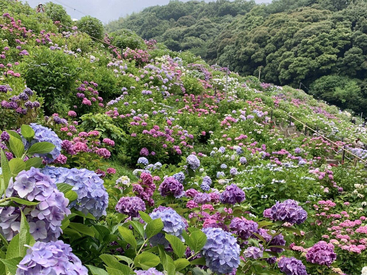 昨年は開催が中止でしたが、今年は開催という事で、形原温泉に行った帰りに、あじさいの里に立ち寄りました。入場料金は500円で、駐車場も満員で結構混んでいました。たくさんの紫陽花の景色に感動しました。山の斜面とため池周辺一面に、5万株の紫陽花を配置してあり、有料の価値があると思います。