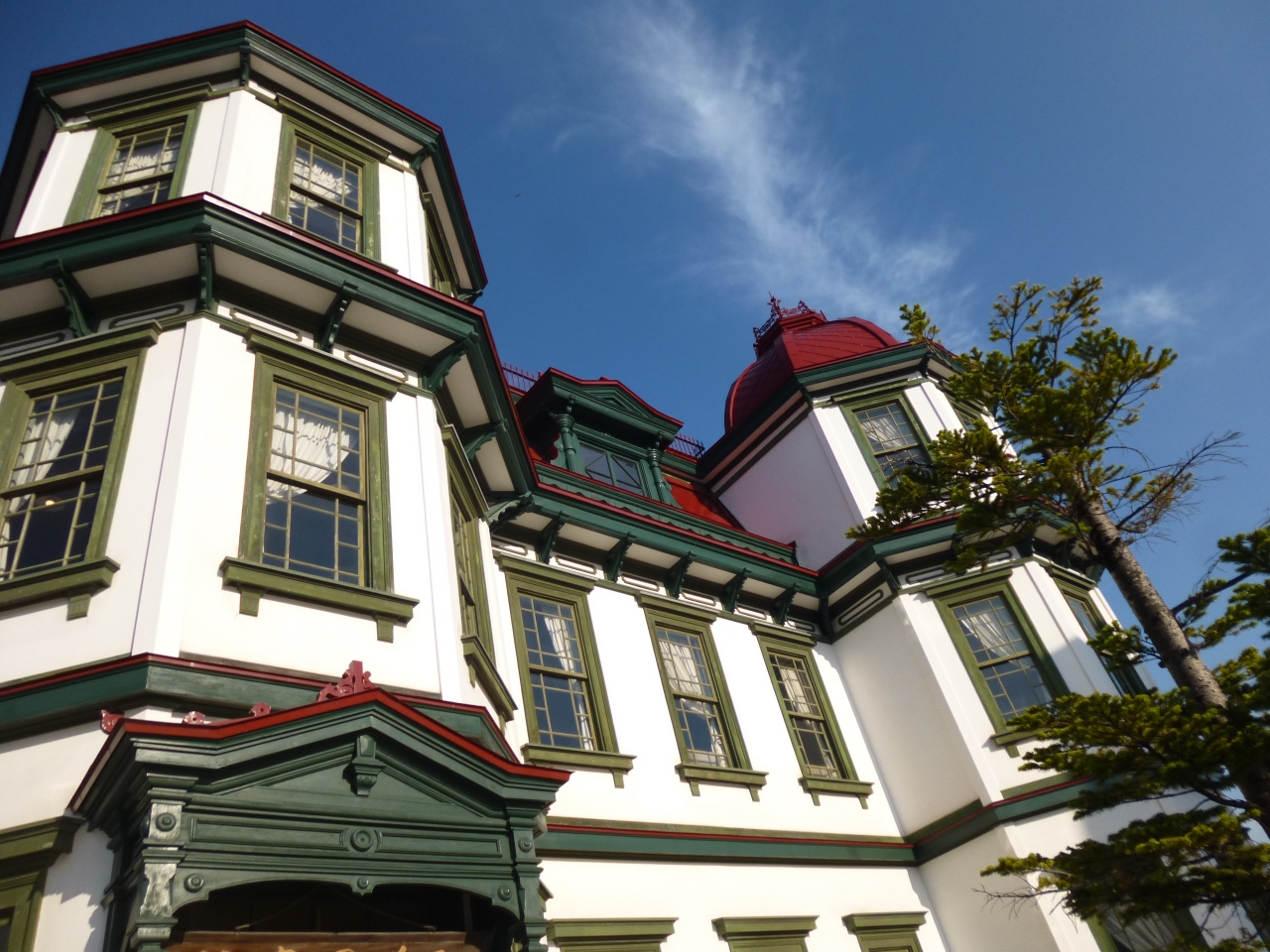弘前公園の南側、大手門広場の一角に、八角形の双塔を持つ建物が見えてきます。これが明治39年に建てられた旧市立図書館で、昭和6年まで図書館として使用されていたそうです。木造洋風3階建てで、ルネッサンス形式を基調としながら、和風様式も多く取り入れられている、斬新で美しい建物です。