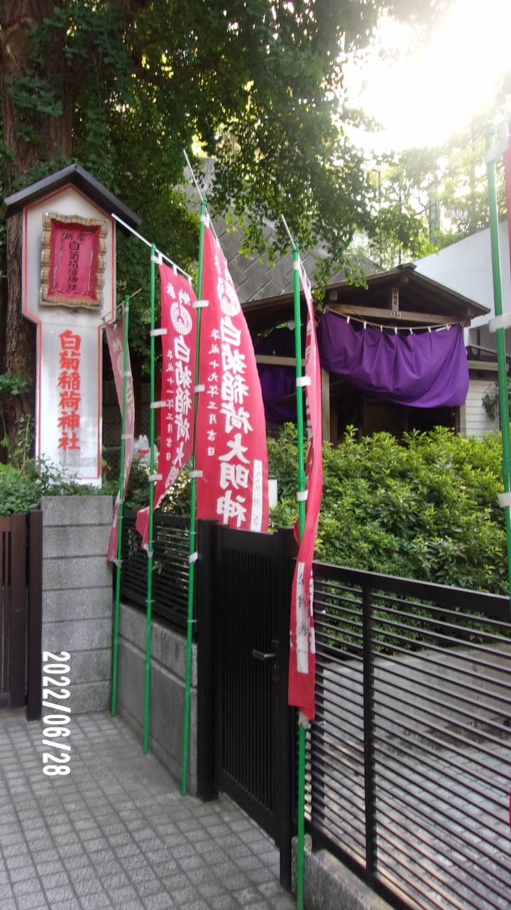 この白菊稲荷神社は大正15年に創建された神社です。地元の人々が集まって守護神として祀ったのです。京都の伏見稲荷神社から分霊を賜っています。JR飯田橋駅から南に15分程度です。メインの通りからは離れています。奥まった場所にひっそりとあります。地元の人だでが知っているいうな印象です。