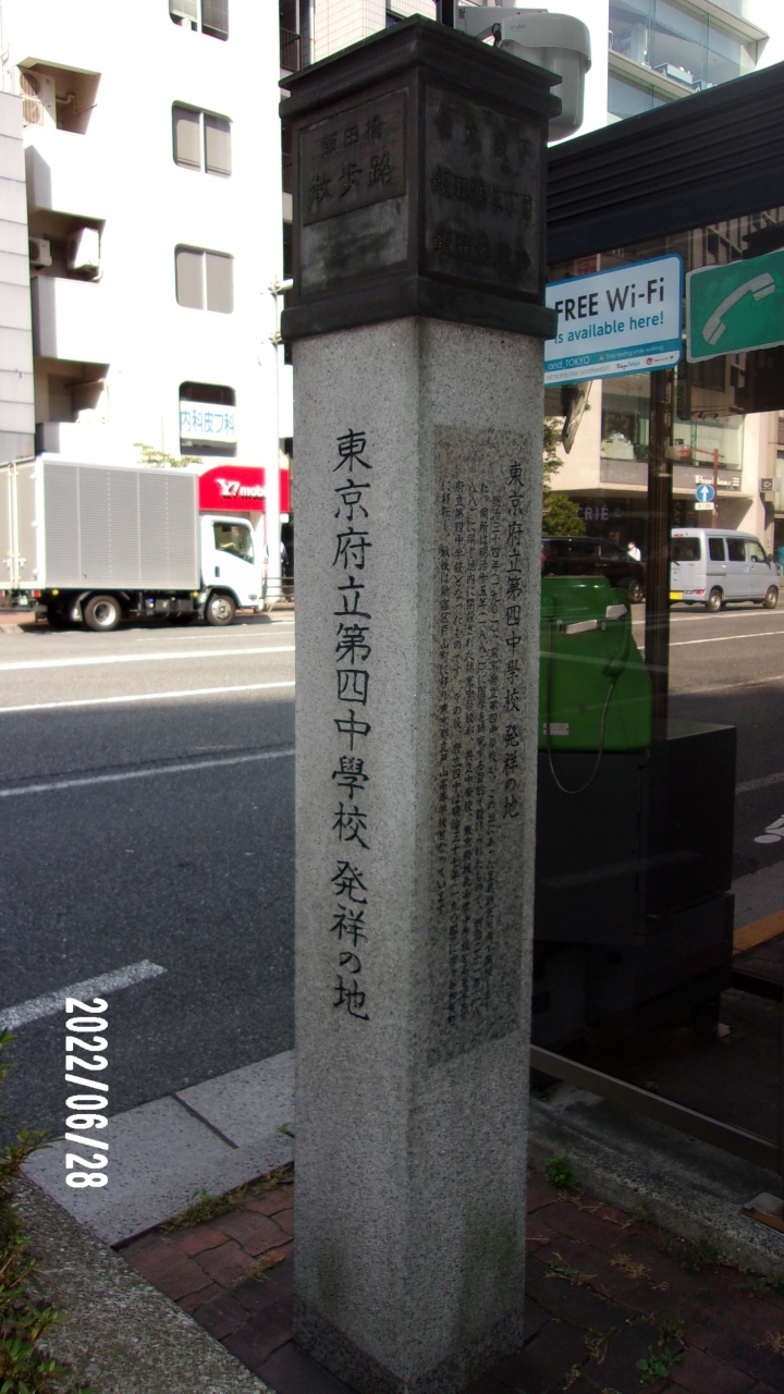 この東京府立第四中学校発祥の地は現在は東京区政会館になっています。その会館の前の歩道の一角に石碑がたてられています。JR飯田橋駅から南東に5分程度の場所です。明治34年に開校しています。その時は当時この場所にあった国学院大学の施設の一部を利用したようです。その後戸山高校となり現在に至っています。場所は新宿区戸山です。