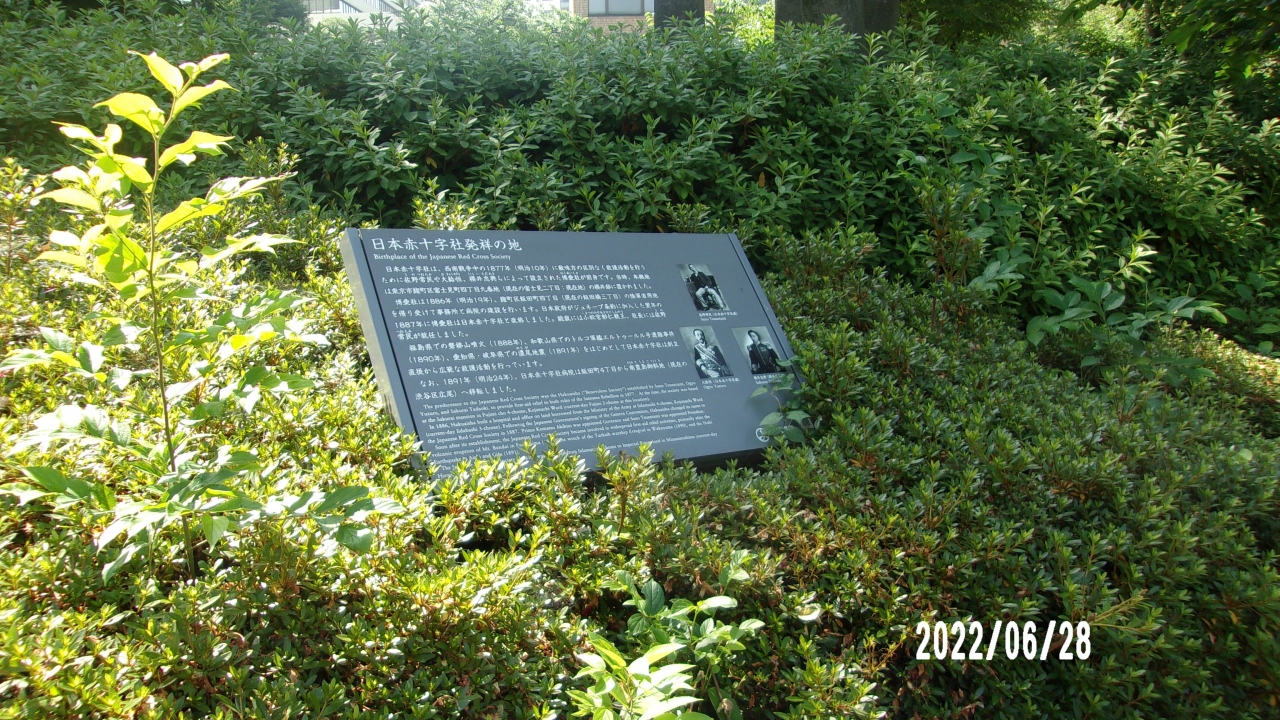 この日本赤十字社発祥地は今は逓信病院の敷地になっています。そこにレリーフ的な説明板的な碑がたてられています。明治の初期の西南戦争を機に敵味方なく負傷者の救護を基本とする赤十字社の前身である博愛社が設立された場所です。今は碑がその経緯と尽力を尽くした人の業績等を紹介しています。