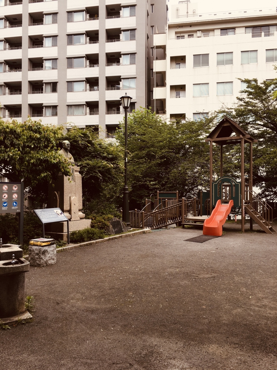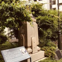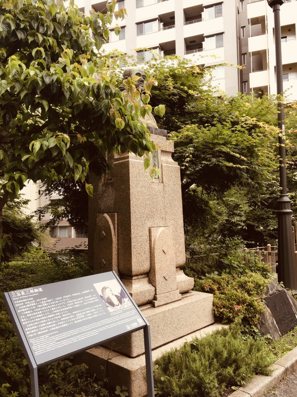 神田明神の裏の宮本公園内にあります。草に囲まれ、公園を見下ろしている少し高い像でしたが、上半身のみの像です。像の横下には説明の看板が日本語と英語であり、本人の写真も掲載していました。像の後ろは草で行くことが出来ないです。