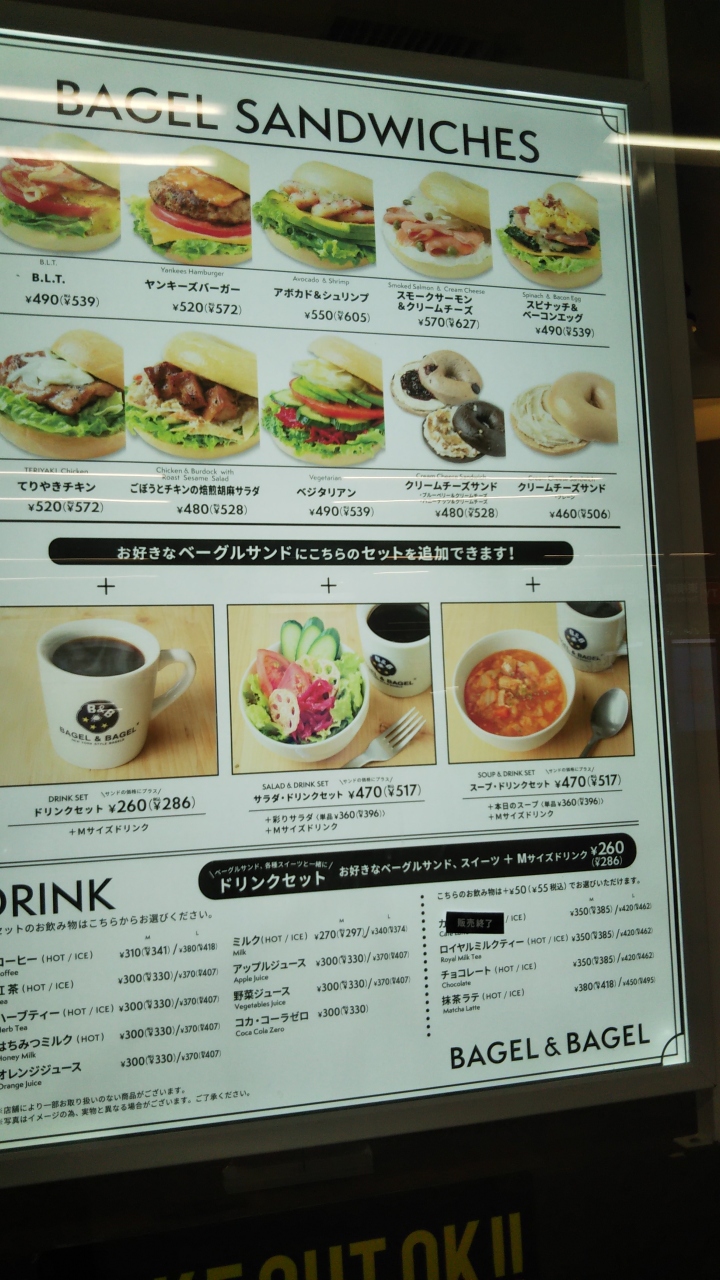 ベーグルアンドベーグルウィズシーノウズベーカリー 武蔵小杉東急店は、東急東横線の武蔵小杉駅改札口を出て、南武線の武蔵小杉駅に向う途中のコンコースにあります。以前も何度かこちらで購入していますが、もっちりしたベーグルが美味しいです。店内でも食べれるようになっています。
