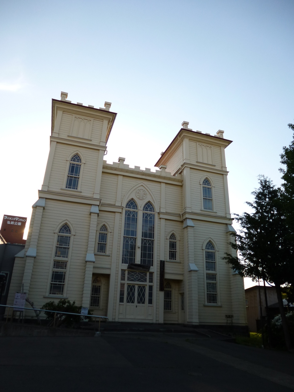 弘前公園の東側にある教会で、1906年に建設されたそうです。双塔とアーチ形の窓が特徴的な建物です。パリのノートルダム大聖堂をモーチーフにしたと言われています。最初の教会は1880年に建てられたそうですが、その後1897年に堀江佐吉による正面中央に尖塔を配置したゴシック風の洋風建築に建て替えられましたが1904年に焼失。現在の建物は、堀江佐吉の息子さんの施工だそうです。