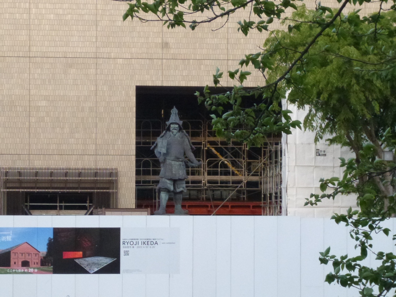 弘前公園の東門近くにある、弘前文化センター。その建物の前に立っているのが、藩祖である津軽為信公の銅像です。文化センターが改修工事に入っているため、銅像にも近づくことはできません。少し離れたところから見ると、壁の向こうに銅像を見ることができます。元は弘前城の本丸にあったそうですが、戦時中に金属回収のために供出されて撤去され20年ほど前に現在の場所に復元されたそうです。