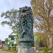 この作品の云われは案内が無かった(見つけられなかった)ので良くわかりませんが、円筒状の下地に草木の彫刻が施されていて、そこの人や動物との共生みたいなイメージの彫刻がありました。