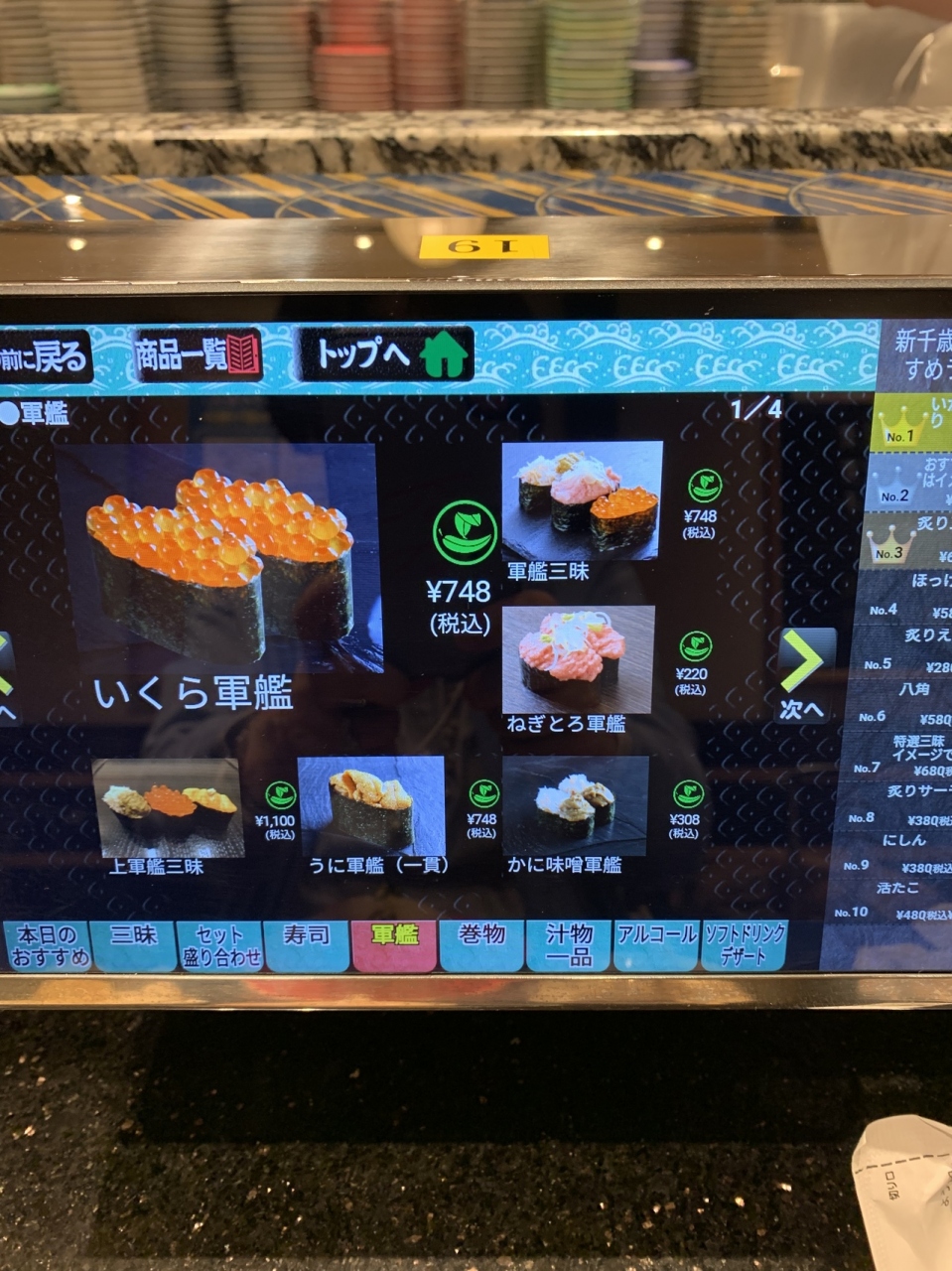 11時ごろ入店したので待ち時間なしでした。美味しそうなのがいっぱいでついつい頼みすぎてしまいます。タブレットで注文するシステムです。メニューがいろいろ細分化されているので難しいです。シニアには。とても美味しいです。結果回転寿司にしてはお高いです。