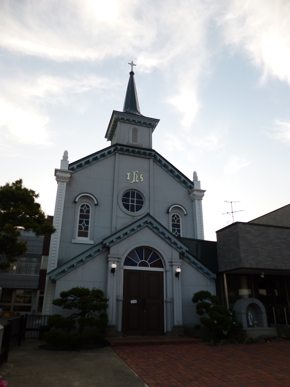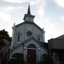 弘前公園東門から東に少し行ったところに、尖頭のある可愛らしい教会が見えてきます。ここが弘前カトリック教会です。尖頭のあるロマネスク様式の木造モルタル造りの聖堂です。青空にとんがり帽子の教会がほっとさせる光景でした。ミサの時間以外は、観光客も受け入れてくれるようです。その時は是非、ゴシック様式の祭壇や、ステンドグラスを見るとよいと思います。