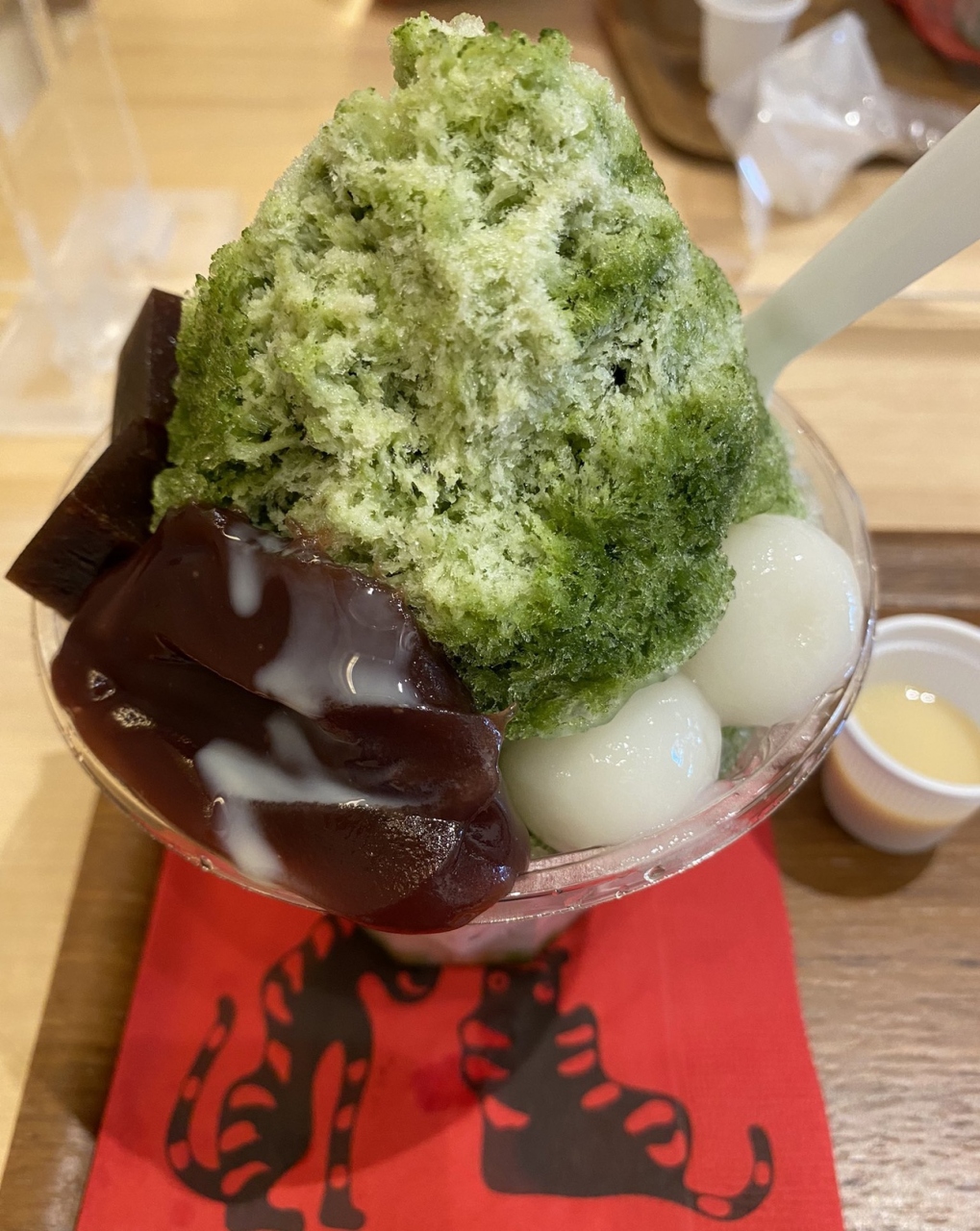6月から9月の期間限定かき氷を頂きました。抹茶の味がしっかりと濃く、茶の苦味があんこの甘さとベストマッチです。とらやの餡子はやはり上品で美味しいなと感じます。かき氷は抹茶、白玉、練乳の3種類があります。