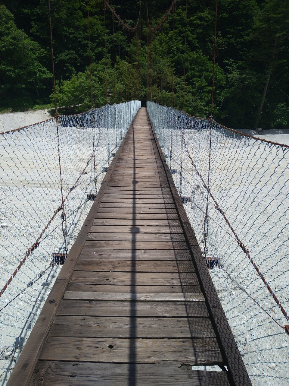 高瀬渓谷は紅葉で有名ですが、観光のオフシーズン6月に行っても深い緑とダム湖の青さと静けさと十分に楽しめます。七倉山荘から奥は、一般車は入れません。許可の下りた地元タクシーに乗るか登山者として歩くかしかないのですが、トンネルを抜けた先には高瀬ダムの素晴らしい景色が広がります。ダムから更に先へは徒歩で、不動隧道を抜けると不動澤橋という吊り橋があり、板が抜けるのではと思う様なスリリングな散策もできました。ここまでなら一般の観光として2時間位でできます。タクシー会社(アルピコタクシー、アルプス第一交通)に事前に相談・予約されるのをおすすめします。