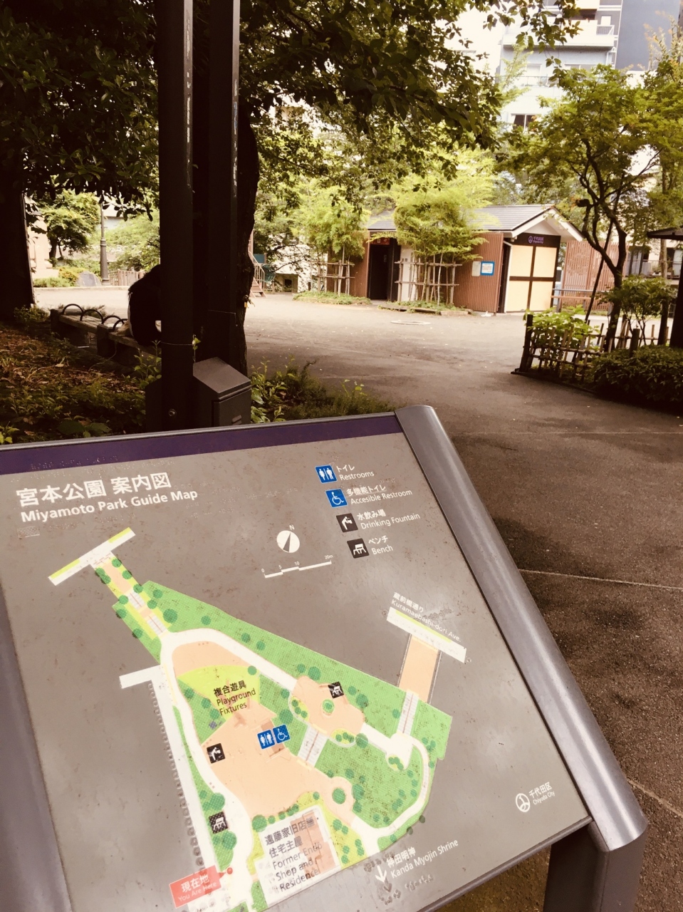 神田明神の裏にあり、目立っていない場所にあるためか人が少なめでした。トイレもあって、著名人の像もあります。真ん中が空間等なっていて、子供の遊戯施設もありました。神田明神と対抗している場所から出ると、階段を降りることとなります。