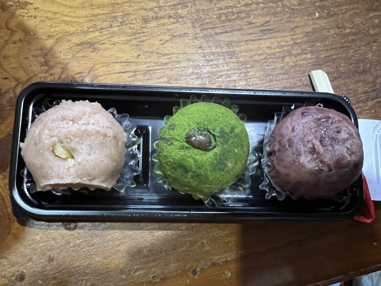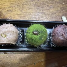 空堀商店街にあります。人気店のようで、私が行ったときは誰もいなかったんですが、見る見るうちに行列ができていました。おはぎはセット販売になっています。3個セットのを買いましたが、カラフルで小さ目なので、一人でも味比べをしてあっという間に食べてしまいました。