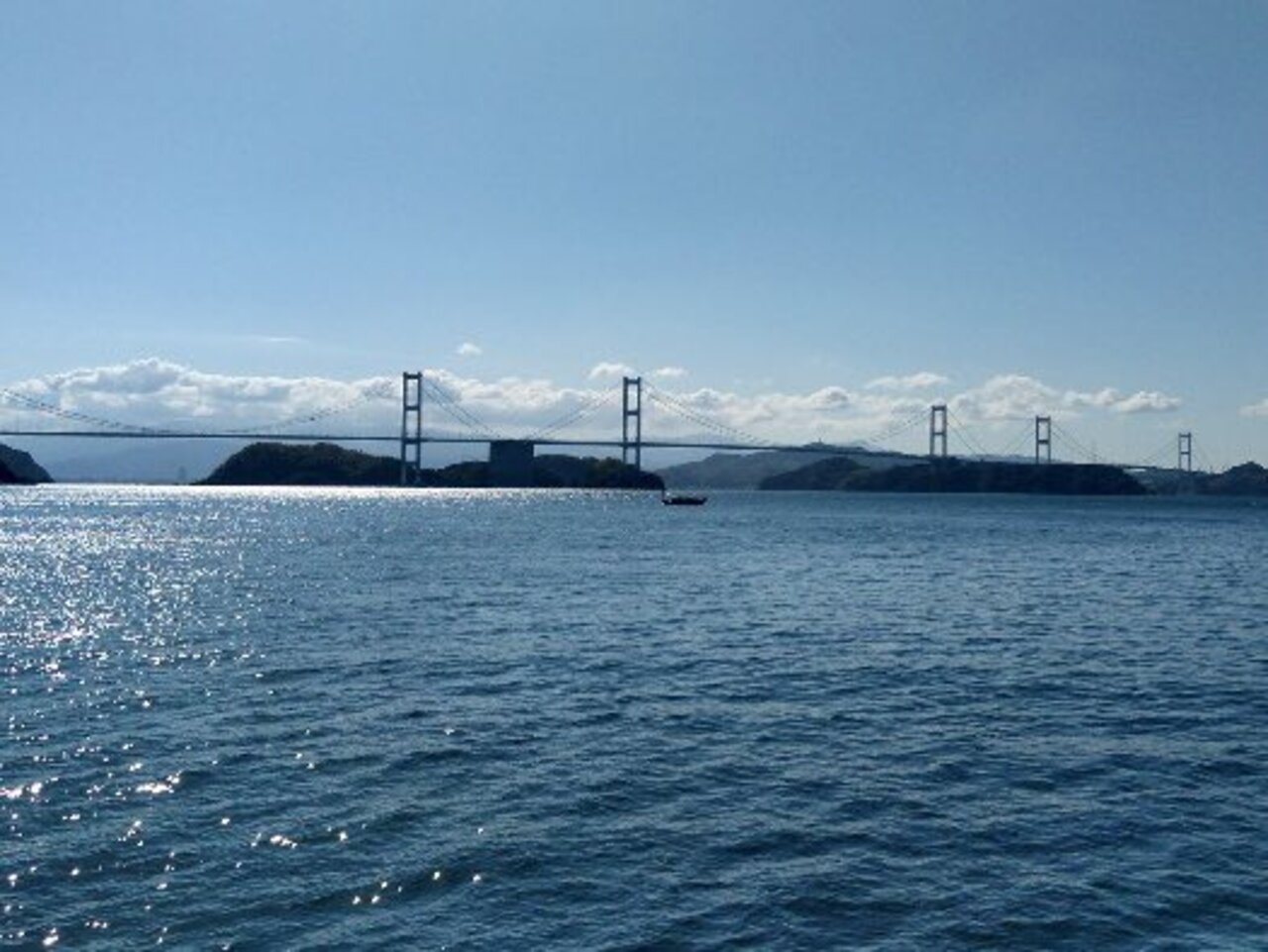 しまなみ海道サイクリング。最後の難関「来島海峡大橋」です。全長4.1kmの橋の上は快適で、天気にも恵まれ、景色も最高でしたが、橋に乗るまでの自転車道は入り口から螺旋のスロープがあって、上がりは、半端なく汗が出て疲れました。下りは快適ですが、スピードが出るので要注意かもしれません。