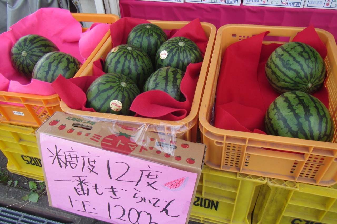 他に、近くの共和町特産のらいでんメロンやらいでんスイカ、野菜はトマトがありましたが、訪れた時の個人的な印象ですが、らいでんメロン、スイカは、近くのイオン余市店で売っているものに比べて、ちょっとは安いかな~という程度でした。