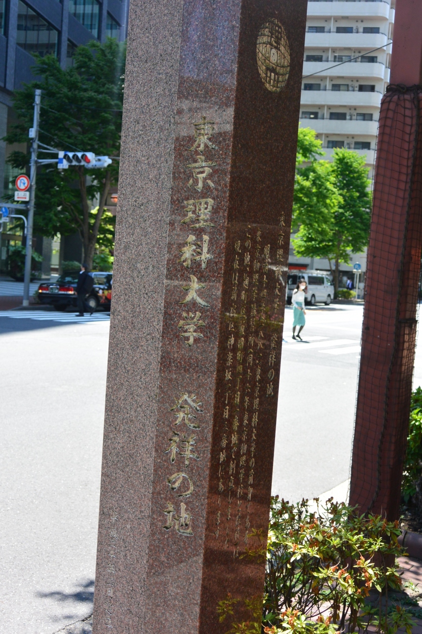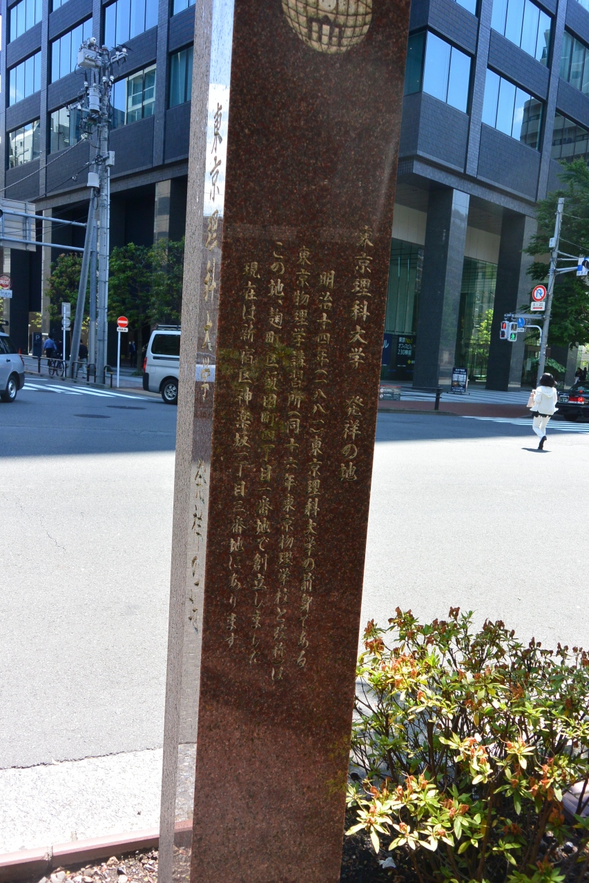 堀留橋の西詰の歩道の植え込みに設置されている石碑です。石碑はまだ新しいようで、とてもきれいでした。その碑の説明文によると、東京理科大学の前身である東京物理学講習所が明治14年にこの場所で創立されたそうです。とても歴史のある学校なんですね。