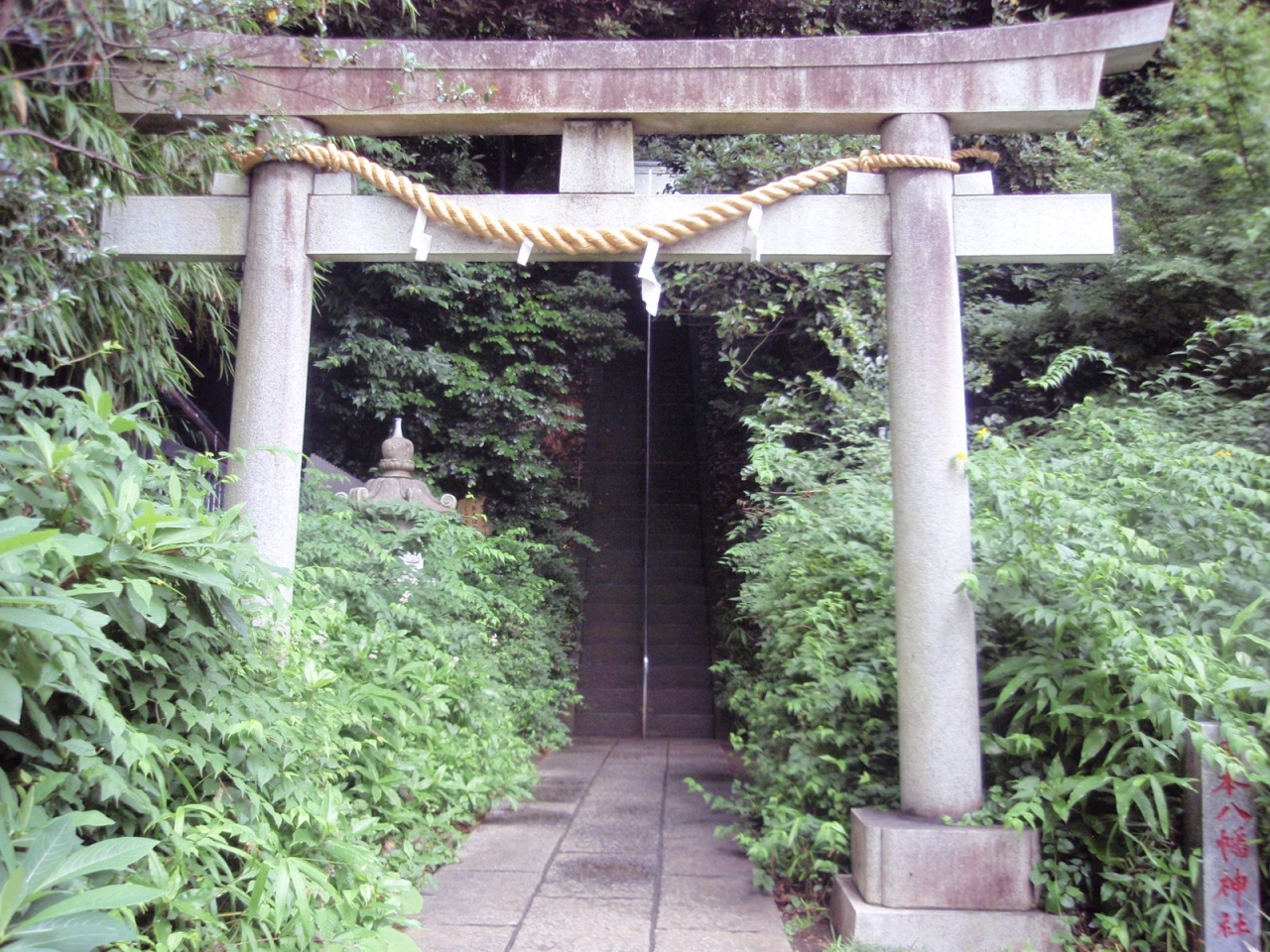 岡本公園の東側に隣接する神社です。創建は不詳、御祭神は誉田別命です。鳥居を潜り急な石段を登ると拝殿、神楽殿、境内社天満宮があります。鳥居を潜ると左に、音楽家松任谷正隆・由実夫婦寄贈の石灯籠があります(写真の鳥居の先に見える石灯籠)。氏子さんでしょうか。鬱蒼とした樹木に囲まれ、静寂を感じる神社です