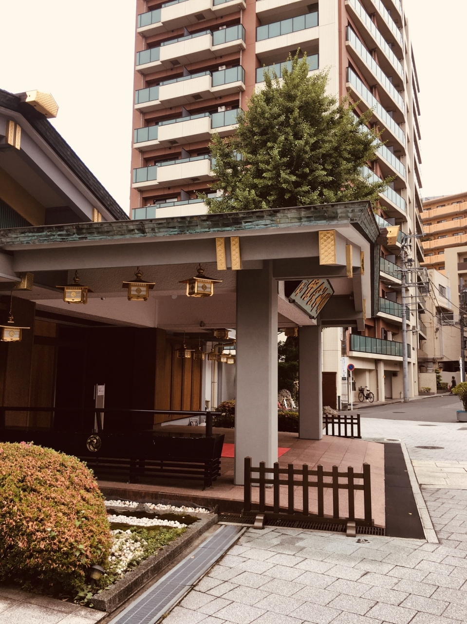男坂を上がり、横には大きな木が立っていました。2020年1月にリニューアルした建物で1階建てで二重の三角形の屋根が特徴的です。結婚式、会合、宴会施設等があり、会議も出来る場所です。会館の前は神田明神の境内です。