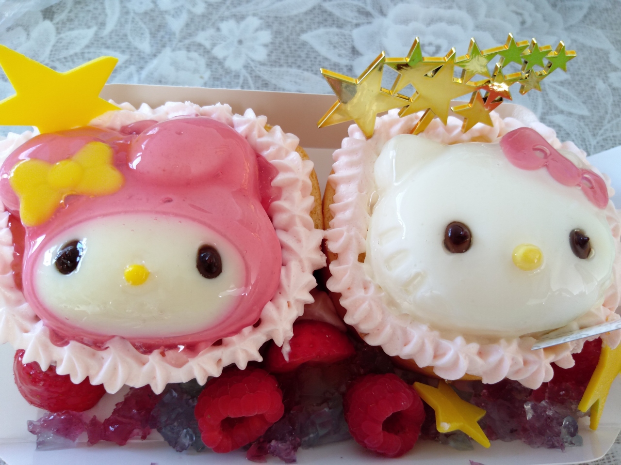 ローキティとマイメロディをモチーフとした七夕限定ケーキ「サマーフレンドリー」が、7月1日~7日だけの限定販売なので購入。星形のチョコと、天の川に見立てたクラッシュゼリートッピング。ハローキティとマイメロディの土台には、堂島ロールを使用していておいしい。