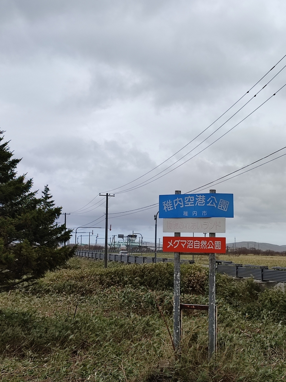 稚内空港周辺には湿原が広がるエリアがあり、そこに稚内空港公園の看板がありました。ただ、近くにはメグマ沼自然公園という場所があり、その看板も併記されていたのでイマイチの区分けというか違いがわからない感じでした。