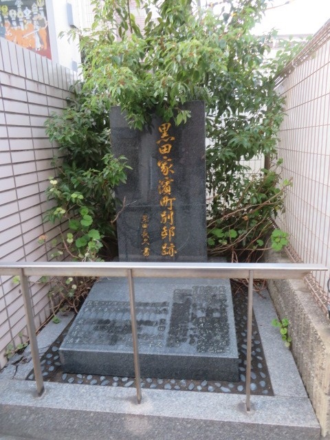 昭和通りから入ったところの消防局の敷地内にあります。壁と壁の間に挟まれた場所にある小さな石碑なので、頑張って見つけましょう。黒田家とは、旧福岡藩主の黒田家の別邸です。黒い立派な石碑で、その前にぼんやりとした写真みたいなものもある趣のある碑でした。