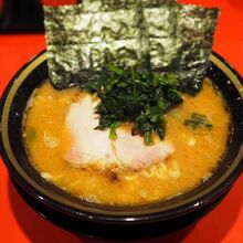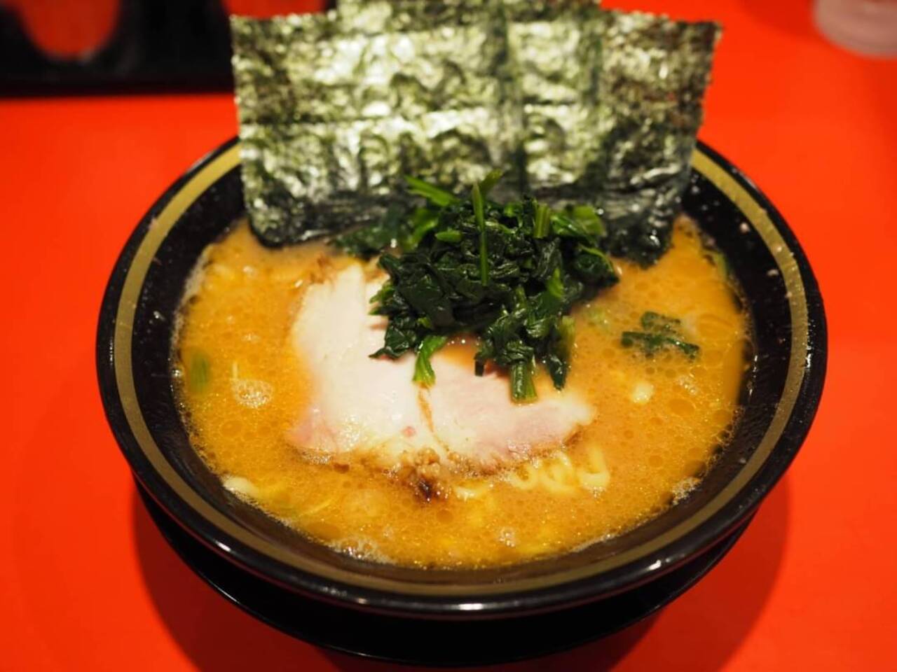 家系ラーメンをたべられます。そのままでまず食べてみて半分ほどたのしんだあとは、卓上のギョウジャニンニクやきざみしょうがで味変を楽しめます。