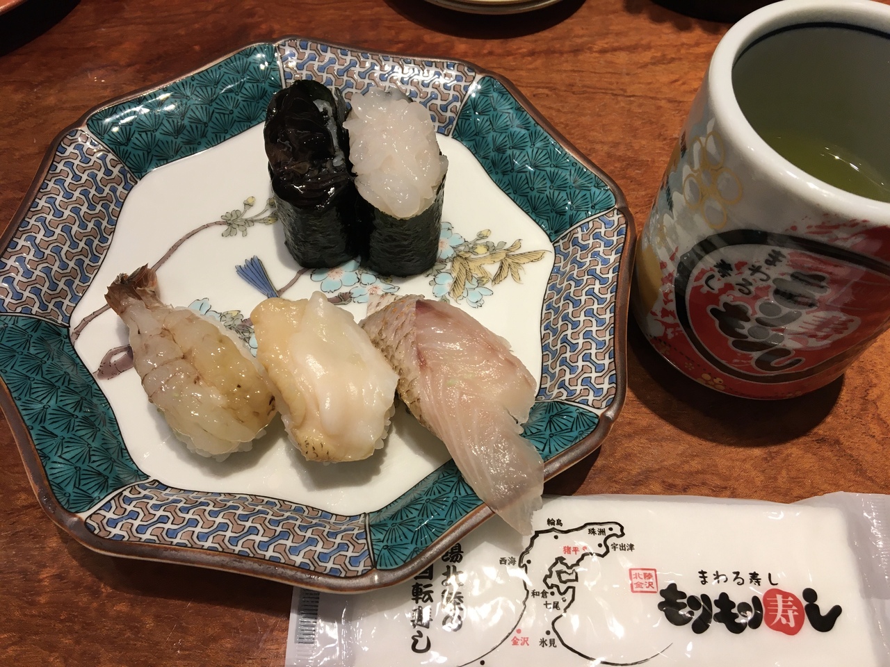 お味噌汁が付く、おまかせセット(1760円)もお得で気になったのですが、せっかくなので北陸5点盛り(1430円)をオーダー。のどぐろや海老など、金沢で食べたいと思っていたお寿司が食べられて満足でした。