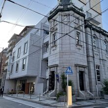 レトロな洋風建築が多くある三条通りに面して建っています。建物全体が保存されているわけではなく、一部のみが残され現代建築に改築されています。三条通りのレトロ建築はレンガの印象が強いですが、こちらの外壁は石張りになっています。屋根の形も個性的で素敵な建物です。