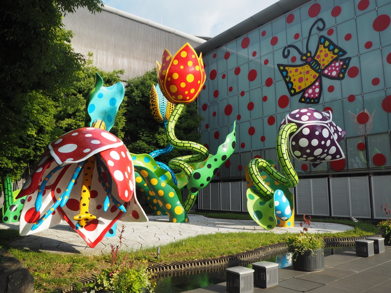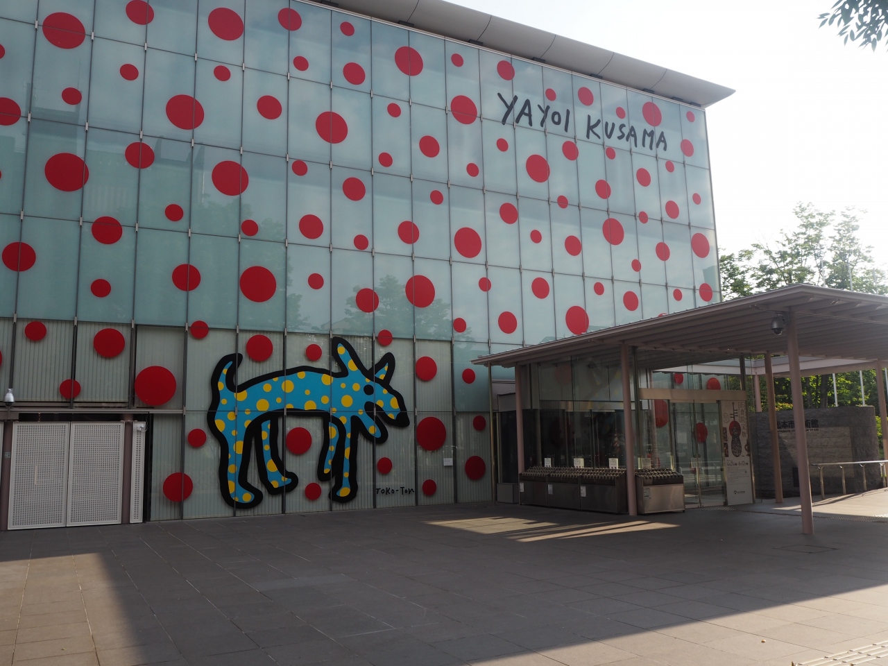 松本駅前の広場からあがたの森通りをまっすぐ10分ほど歩いて来ると左に松本市立美術館があります。美術館の正面の壁には水色のベースに赤い水玉がちりばめられ、正面左の敷地には草間彌生のチューリップに水玉がちりばめられたオブジェ(幻の華)が置かれています。ここで目的のほとんどは終わった気がしますが、館内には草間彌生の大いなる巨大な南瓜も展示されています。