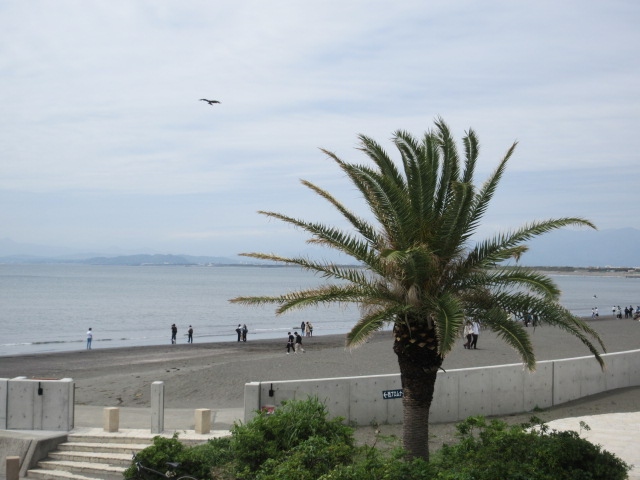 江の島に観光に行く前に立ち寄った公園です。海に向かって歩いていくとたどり着きます。横に広い海岸沿いの公園です。天気が良かったこともあって修学旅行生をはじめ、たくさんの人々で賑わっていました。海岸以外にも芝生の広場などもあり、遊具のある広場などもあります。ヤシの木とかもあって南国気分です。