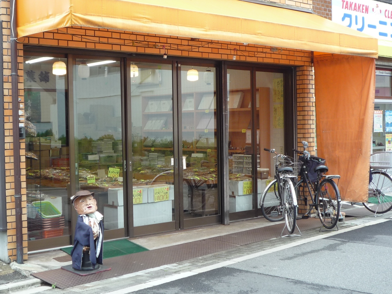 黄色いテントに妖怪爺爺?が目印で、ガラス戸越しに店内の袋詰めされた菓子いっぱい見えます。