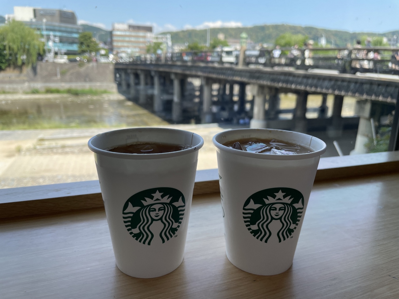 京阪三条駅からすぐ、鴨川にかかる三条大橋の横にあるレンガ張りの建物にお店が入っています。非常に開放的な店内で、窓側のカウンター席からは鴨川と三条大橋の景色が素晴らしかったです。納涼床も設置されていて、ゆっくりとお茶を楽しむことができます。