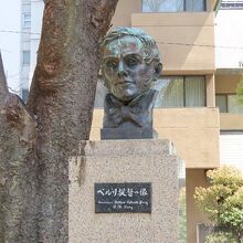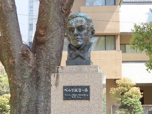 なぜここにペリー像が? と誰しもが思いますよね。日本の開国百年祭が1953年に企画されていて、日本がこのときアメリカに送った石燈籠の返礼として、翌年、ペリー提督の出身地、ニューポートからこの胸像が贈られたのだとか。日本でよく見かけるペリーの肖像がベースになっていないので、なんか顔が違う、と思ってしまうのも無理ないところですね。で、この胸像は6年後に除幕式が行われているそうです。すぐ近くに万延遣米使節記念碑がありますから、日本の開国にゆかりのあるモニュメントとしてこの場所に置かれた可能性を感じます。