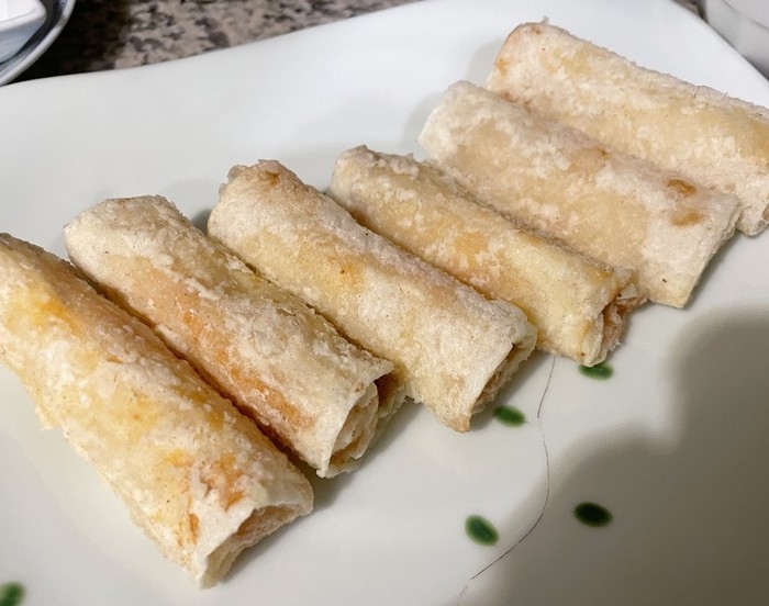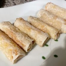 春巻きの厚くて硬い皮と違い、ウエハーウースのように軽い歯ごたえでサクサクで低温で揚げるのがポイント!!