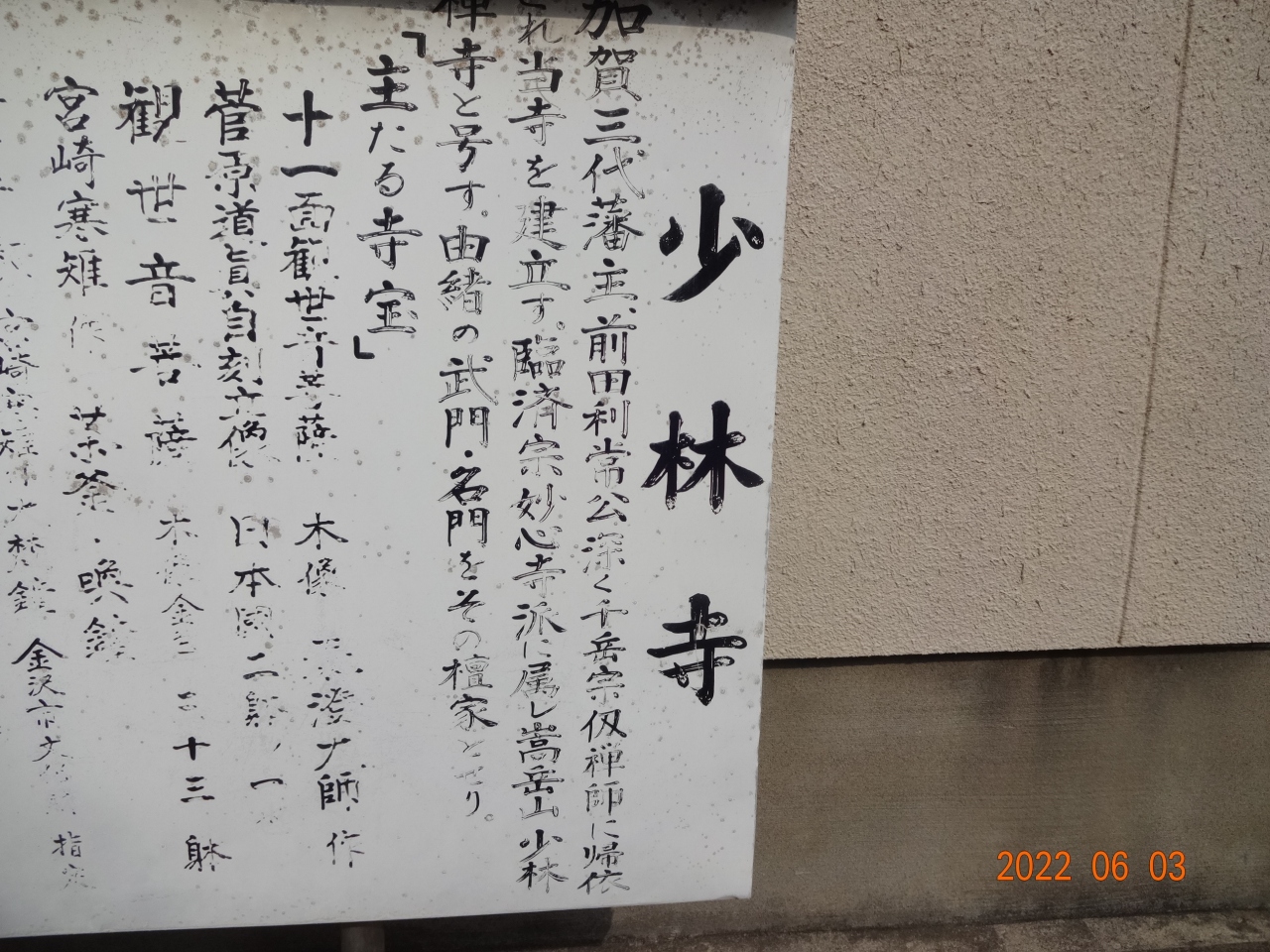 金沢の寺町を散策している時に立ち寄ったお寺です。広い境内でしたが、すっきりとしてシンプルな印象を受けました。少林寺の梵鐘は、金沢市の指定文化財だそうです。境内にある梵鐘の前に案内板がありました。