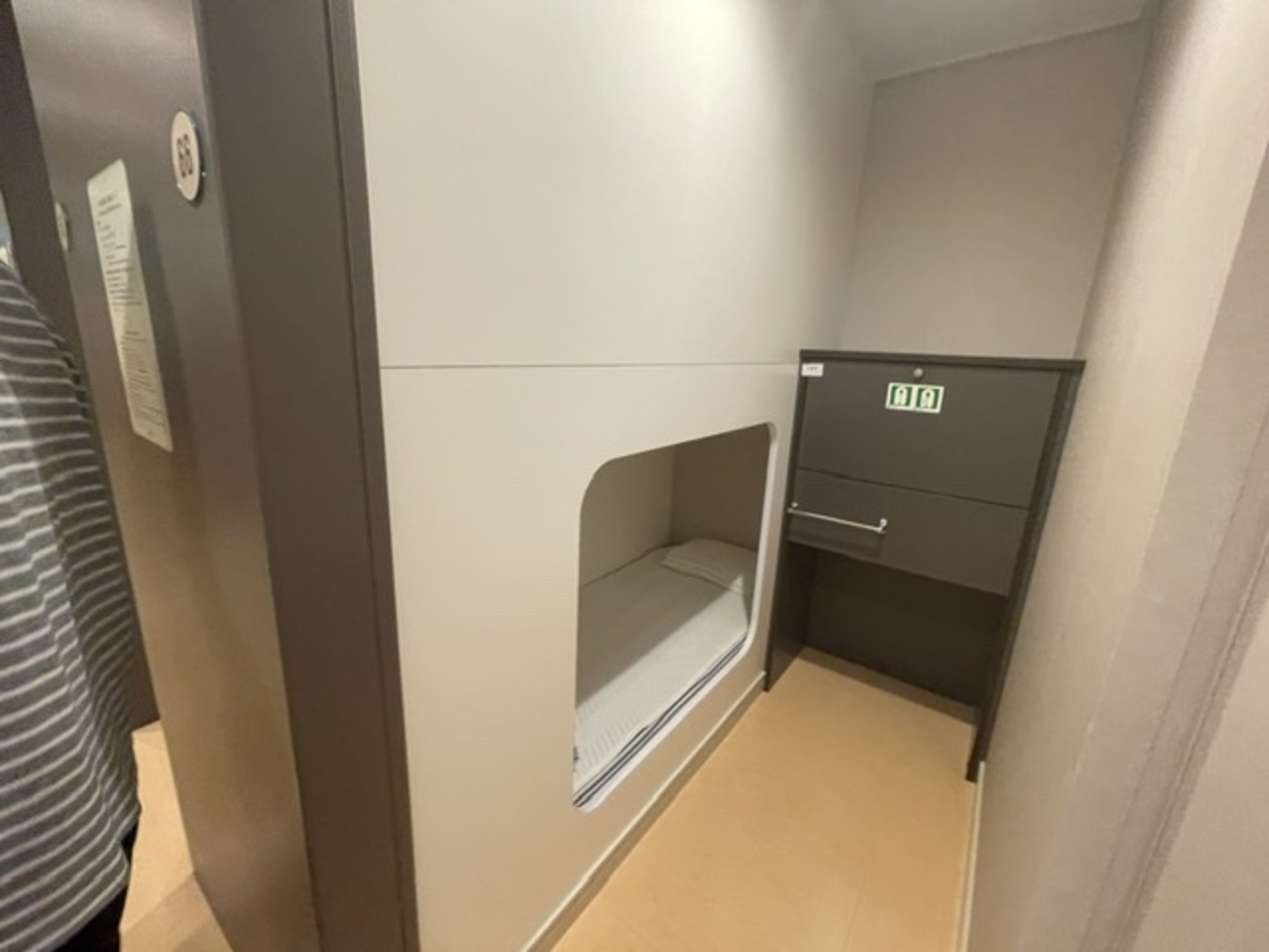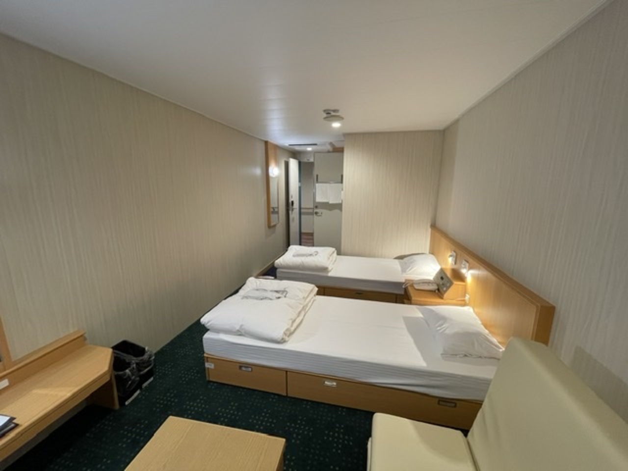 基本運賃プラスルームチャージ28000円です。部屋はビジネスホテルより広い部屋なイメージ。シングルベッド2台とベッドになるソファがあり、感覚としては2人で使うとかなりゆったり、4人で使っちゃうとベッド以外のスペースがなくなるので窮屈そう、そんな感じでした。室内にテレビ、冷蔵庫、湯沸かし器、トイレ、洗面台、シャワー有り。