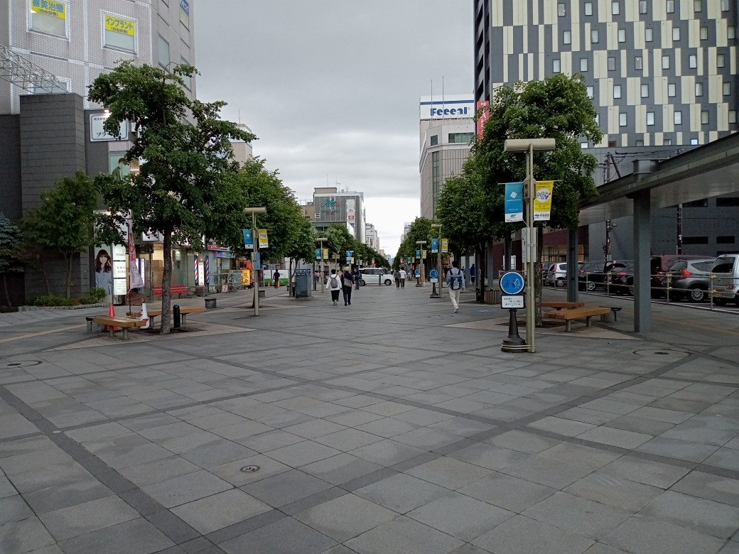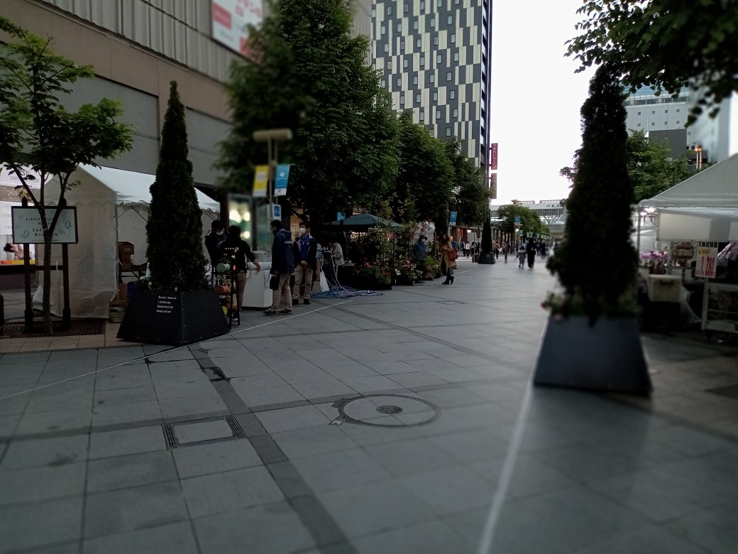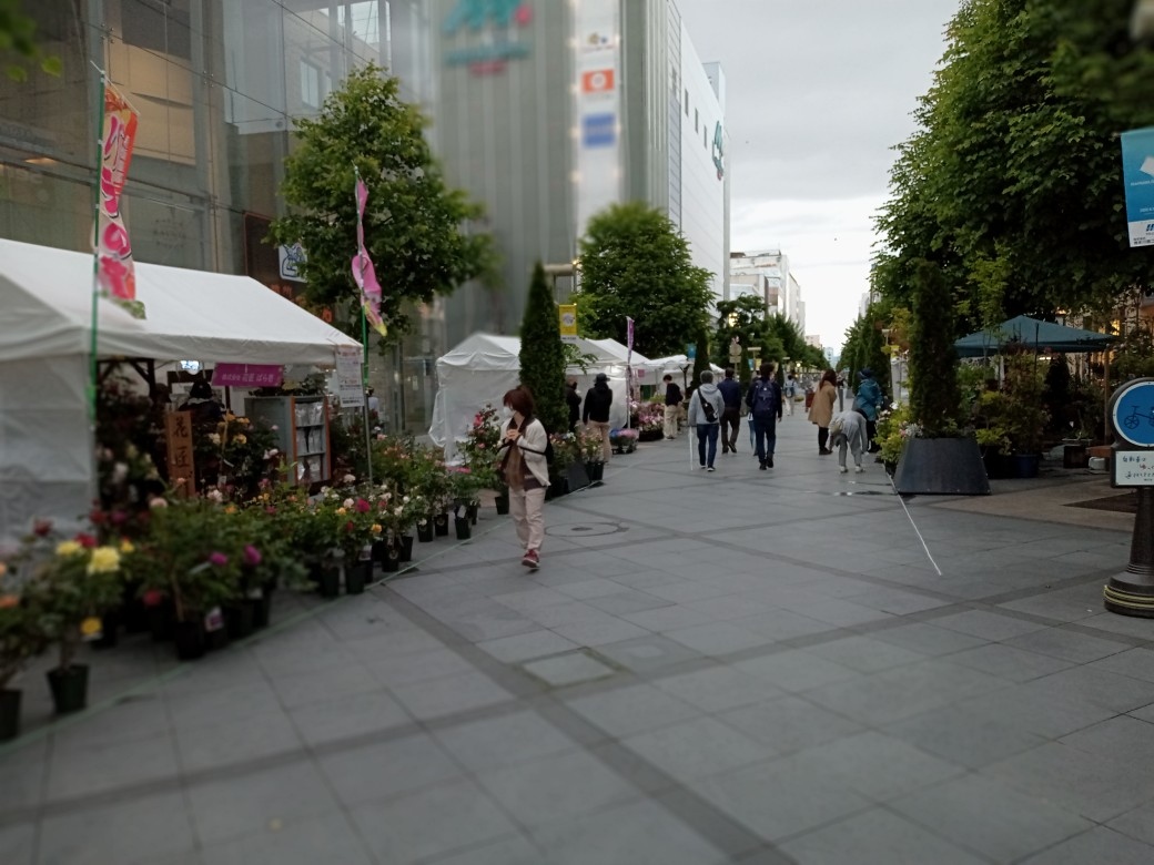 旭川出身者としては、全国に誇れる場所です。以前は、」平和通りという名称で、旭川一の通りだったのですが、日本で初めて、常設の歩行者天国にし、平和通り買物公園と名付けられました。彫刻や休むところが多く、旭川を「彫刻の街」と呼ばれる象徴的な場所です。この日は、花のイベントが開かれていました。夕涼みがてら市民が多く散策していました。