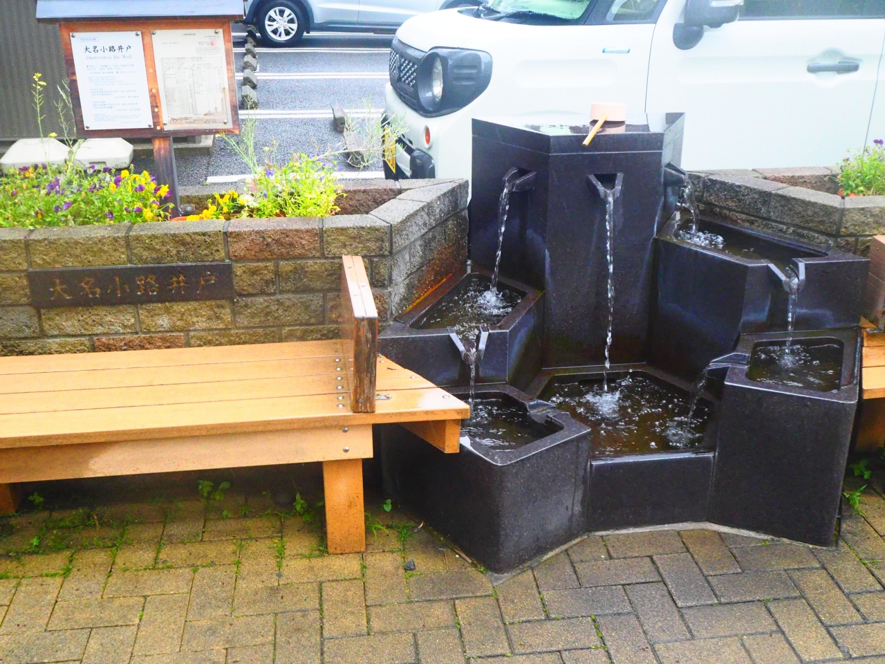 松本城の南から大名町通りを歩いて来ると松本城公園へと入る手前に大名小路井戸があります。松本は盆地に出来た町なので、多くの湧水スポットや井戸があり、ここはそのひとつです。最近2年ほど前に湧水の出る場所が作り直されて、モダンな方形のオブジェになっています。湧水の出ているのも楽しめます。